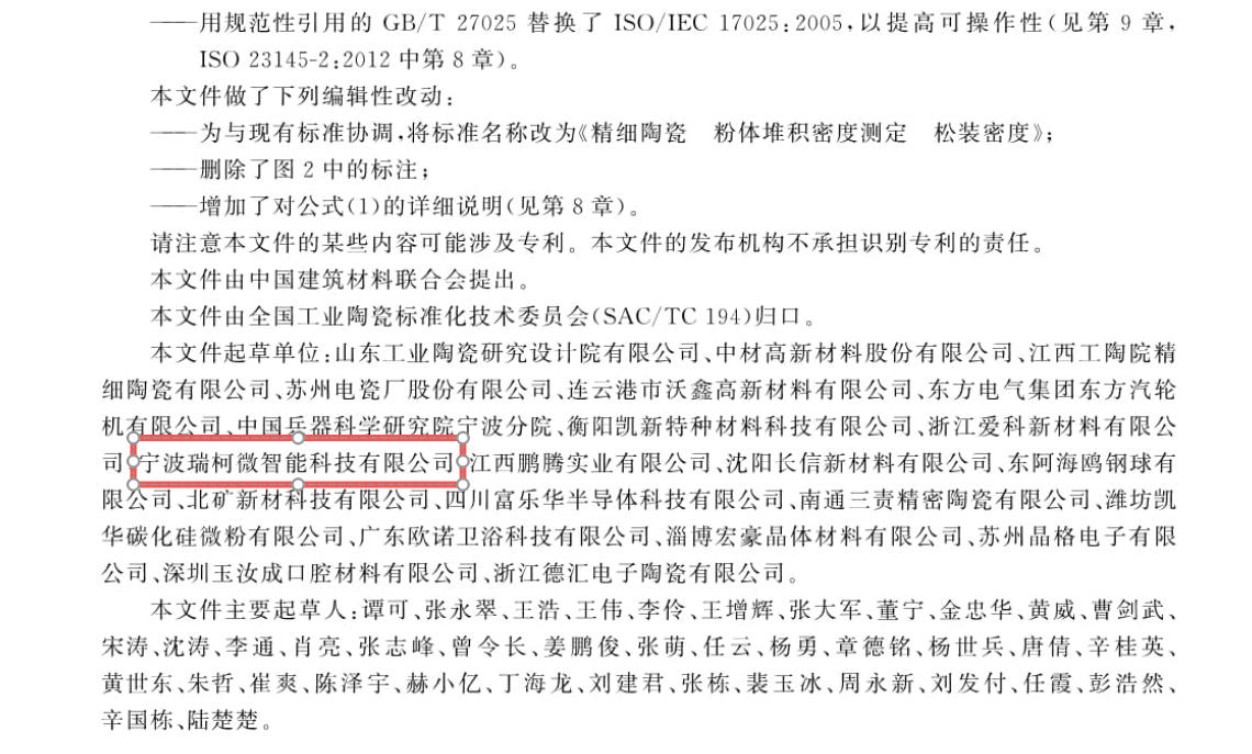 當 GB/T 45760-2025《精細陶瓷 粉體堆積密度測定 松裝密度》標準的發布公告出現在國家標準化管理委員會官網時,寧波瑞柯微智能科技有限公司的研發團隊難掩激動 —— 這支深耕粉體檢測技術十余年的隊伍,終于將實驗室里的技術沉淀,寫入了行業發展的 "教科書"。