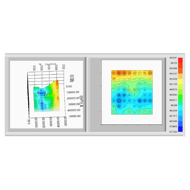 自動加壓檢測:設備探針自動勻速下落,輕柔接觸樣品表層,系統輸出恒定電流并采集電壓信號,自動完成單次方阻測算。