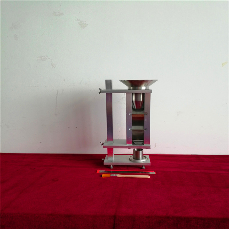 設(shè)備---裝置(圖1)頂部有一個(gè)具篩漏斗,其孔徑為1.00mm。漏斗安裝在一個(gè)由四塊玻璃擋板組成的折流箱上,樣品粉末流入時(shí)可以在這些玻璃擋板上滑動、抖動。折流箱的底部的漏斗用來收集樣品粉末,樣品粉末可以通過此漏斗直接流入到下面已知體積的接收杯中。接收杯可以是量筒(25.00 ± 0.05 ml、內(nèi)徑30.00 ± 2.00 mm)或廣口杯(體積16.39 ± 0.2 ml,內(nèi)徑25.400 ± 0.076 mm)