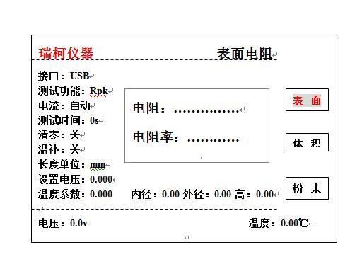 2、液晶顯示: 電阻率、壓強、溫度、電導率、電流電壓、可輸入測試樣品數據(圓柱:直徑,高度;方體:長*寬*高)單位可以切換(mm、cm、m)