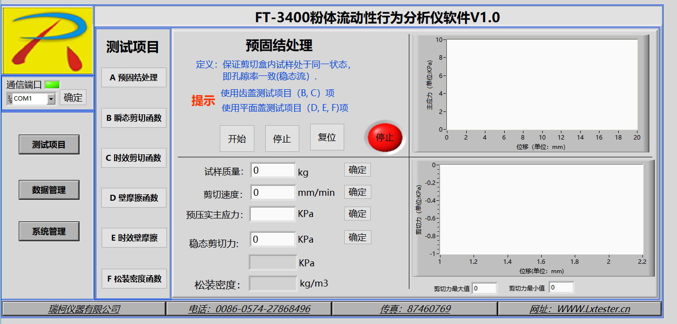 分析和測試如下數據:莫爾應力圓、內摩擦角、主應力、剪切力、屈服軌跡、穩態流、流動函數、開放屈服強度(無側限屈服強度)、內摩擦時間角、時效屈服軌跡、堆積密度、密度軌跡、壁摩擦角、附著力、壁剪切力、壁應力、壁軌跡、運動摩擦角、靜態摩擦角、料倉設計的料斗半頂角、卸料口徑、流與不流判定、流動因子、初始抗剪強度(內聚力)等數據分析.